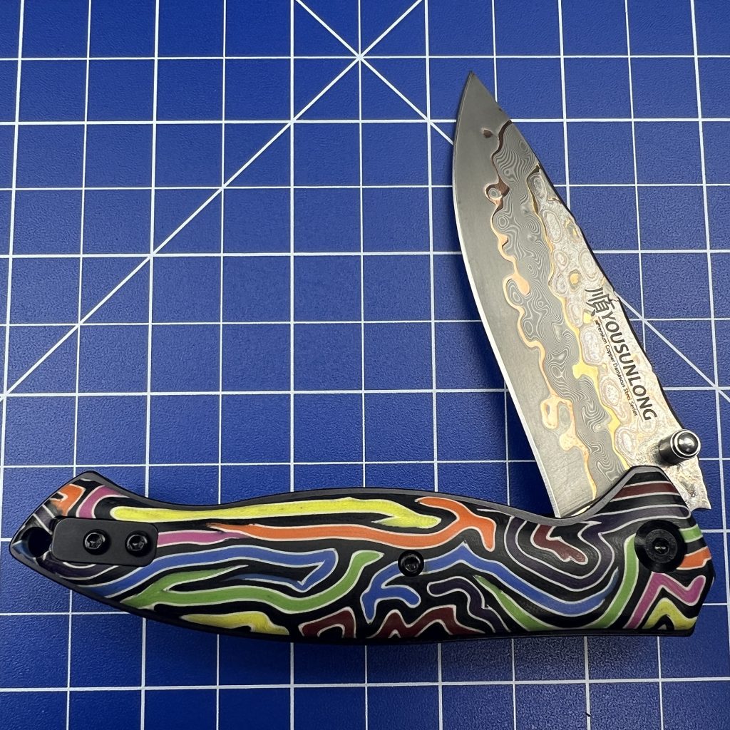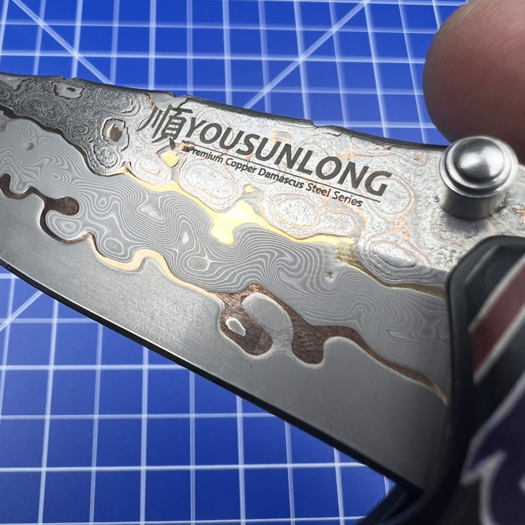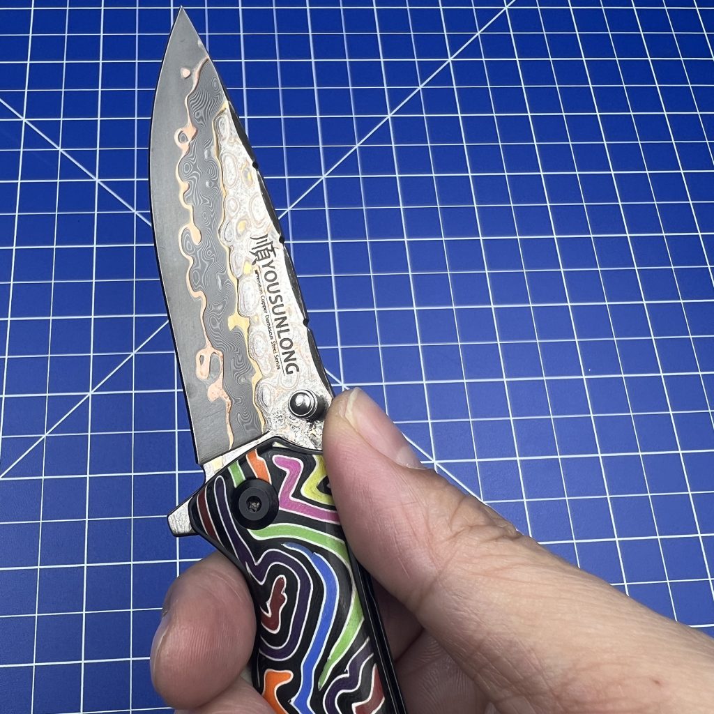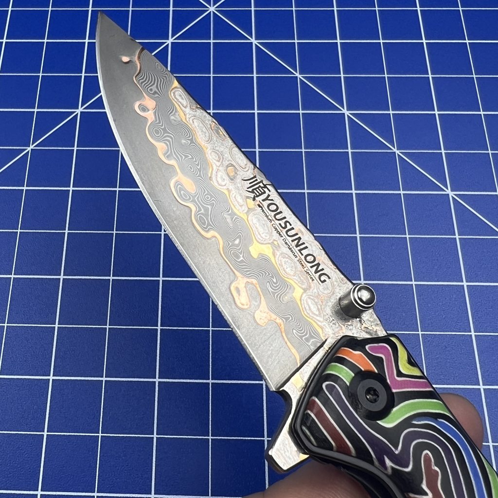 Sitting under the warm, analytical glow of my desk inspection lamp is the newly released mid-March drop from YOUSUNLONG: a Folding Knife featuring a highly versatile Drop Point blade, a Colorful G10 handle, and a genuinely mesmerizing Premium CuMai Copper Damascus Steel Blade.