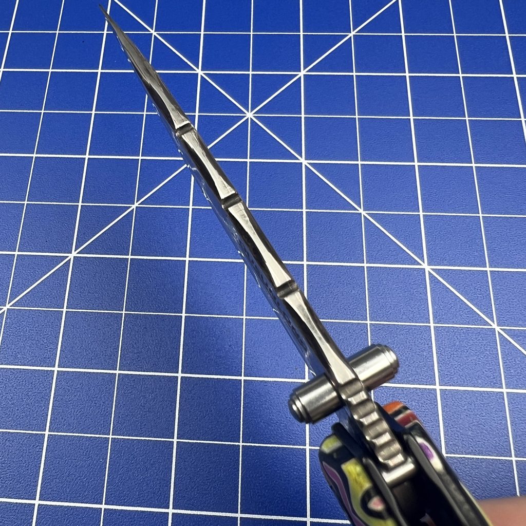 Sitting at the desk, I pressed the flipper tab and deployed the blade. Under the harsh, revealing glare of my inspection lights, the steel is genuinely breathtaking.