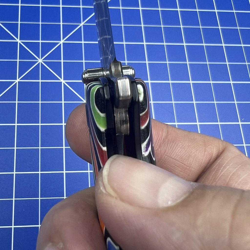 Once open, the blade is secured by a sturdy Liner Lock. Inspecting it closely on the bench, the lockup is early (meaning there is plenty of room for the lock to wear in over years of use) but incredibly secure. There is absolutely zero vertical or horizontal blade play. It feels like a fixed blade once deployed.