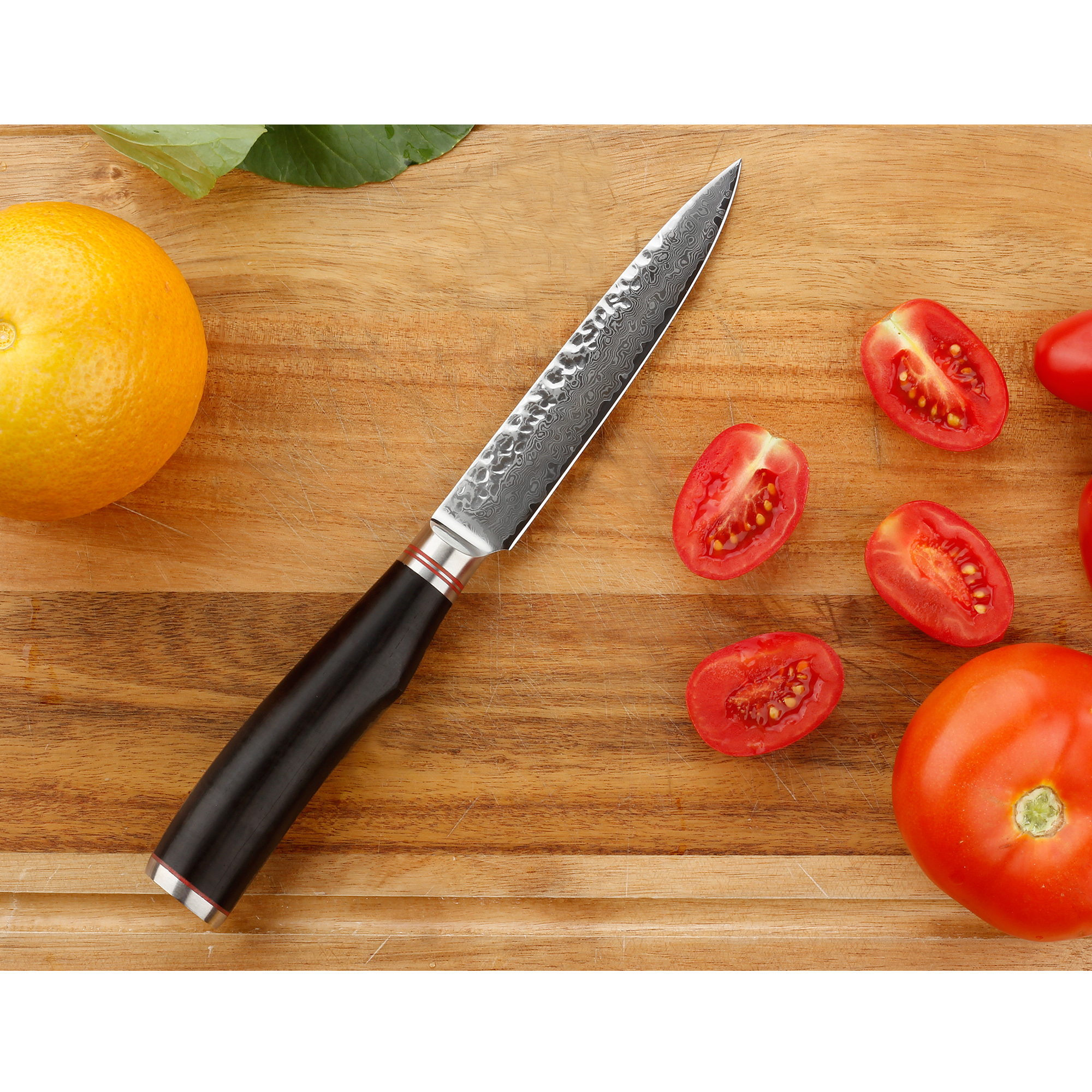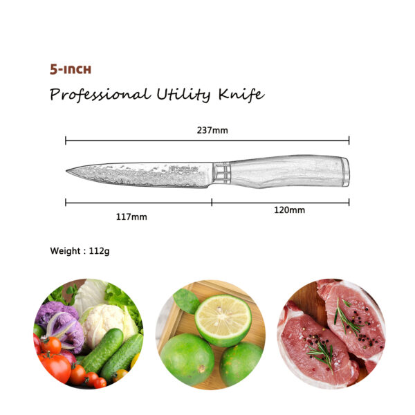 A great knife is made of high quality steel.The core of the blade is high-hardness VG-10 “Super Steel” with a hardness rating of 60±2 on the Rockwell Hardness Rating.An uniquedamascus pattern formation is 66 layers of different hardness stainless steel folded together–33 layers on either side.The blade is mirror polished with good reflectivity,the color of damascus pattern is affected by light.