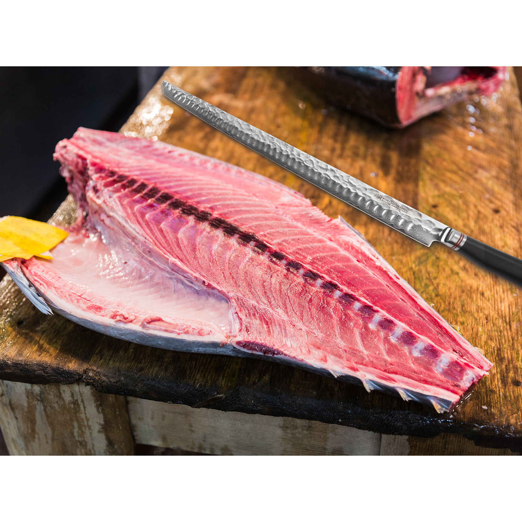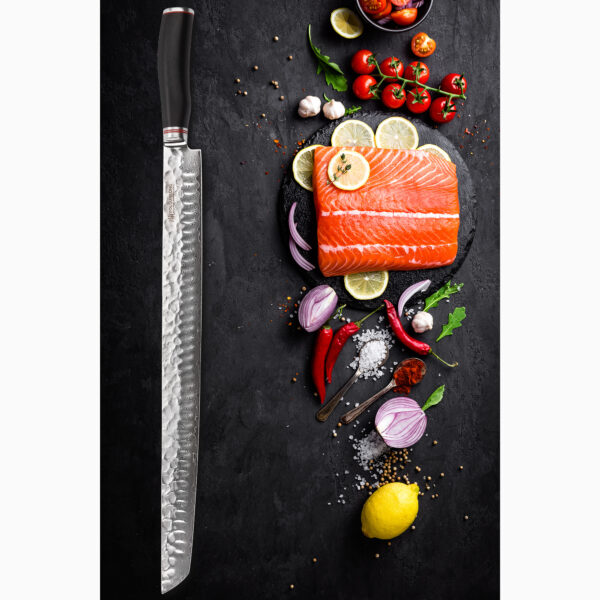 We have specially designed salmon knives of 12‘’ 13‘’ 15‘’ 17‘’different sizes for cutting large pieces of tuna and salmon.