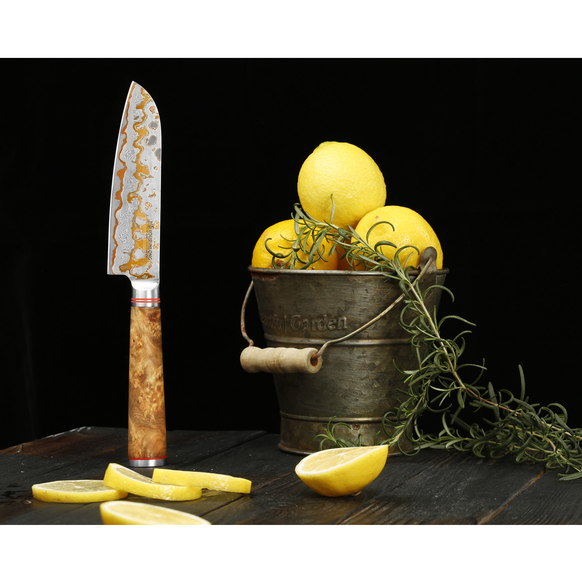 • 【Excellent Choice】Copper Damascus steel is known for its vintage patterns, and the medieval style is recreated by adding brass and red copper to the Damascus steel.This is an excellent material for knives and it is known for its hardness and durability.Copper Damascus knives are an excellent choice for home cooks looking for high quality knives!